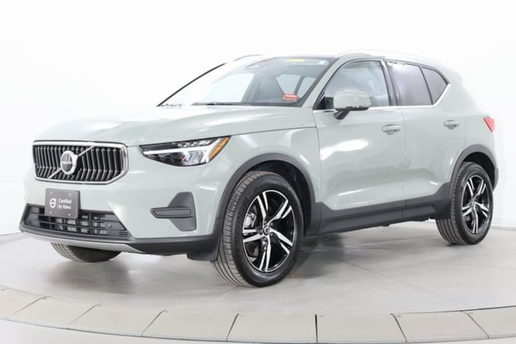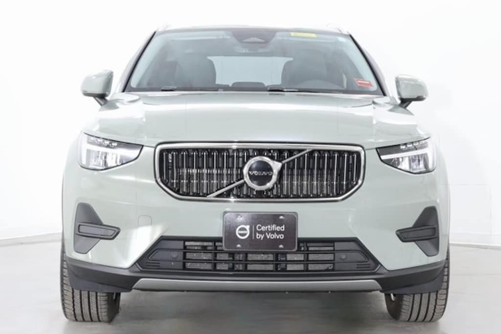 Sage Green 2025 Volvo XC40 B5 AWD Core with leather seats, and a panoramic moon roof. The climate package gives you a heated steering wheel and heated rear seats.